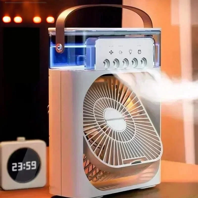 - 3-in-1 Funktionalität: Dieser Mini-Luftkühler fungiert als Ventilator, Luftbefeuchter und LED-Nachtlicht, um mehrere Funktionen in einem kompakten Gerät zu vereinen.